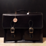 Black folder in grain leather with cheeky olive green stitching and brass buckles.